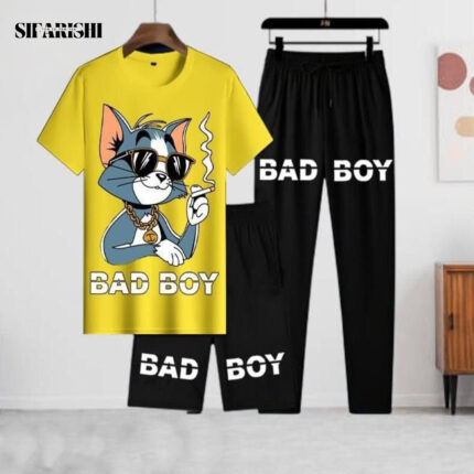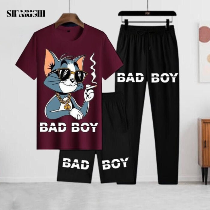 Bring in laid-back vibes with the Maroon Edition of the Tom Printed 3-in-1 Summer Set. With its sharp cartoon print and soft cotton fabric, this set includes a graphic tee, shorts, and matching trousers. Ideal for casual days, streetwear, or lounging at home.